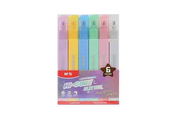 M&G Highlighter Pen Hi Cube Glitter Square St Of 6 Colors Gentle